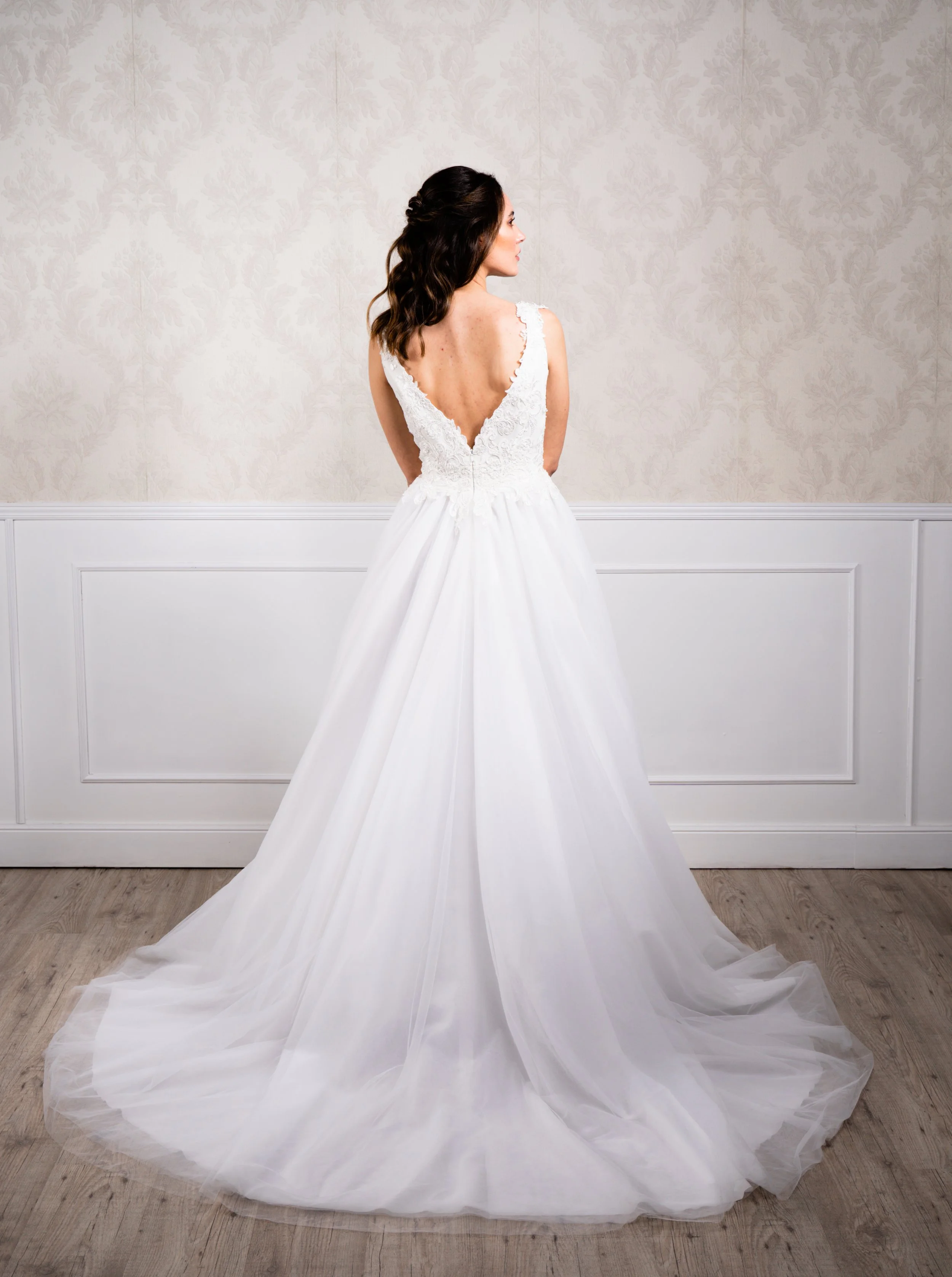 mellea Vestido de corte princesa elaborado en tul suave con pedrería blanca en cuerpo Talla disponible: 38/40